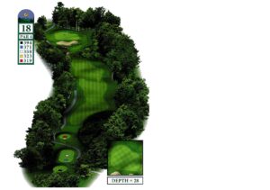 A good drive with a 3-wood or driver off this par-4, 394-yard hole will leave a clear view of the hole. The distance is about 260 yards to go through the bend. It’s important to check pin placement here since this deep green has three tiers and is 40 yards in depth.