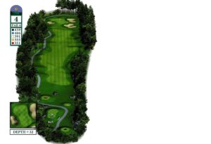A solid drive in the left-center of the fairway is ideal. Long hitters can reach this in two shots. A good lay up is center of the fairway leaving enough room for a full swing approach with a lob wedge. The tiers on the green really come into play. Birdies can be made if the approach is on the same tier as the pin.